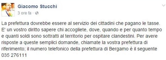 Poco dopo gli fa eco il leghista Giacomo Stucchi, senatore bergamasco e presidente del Copasir, che dal suo profilo lancia un analogo invito pubblicando il numero della prefettura di Bergamo: