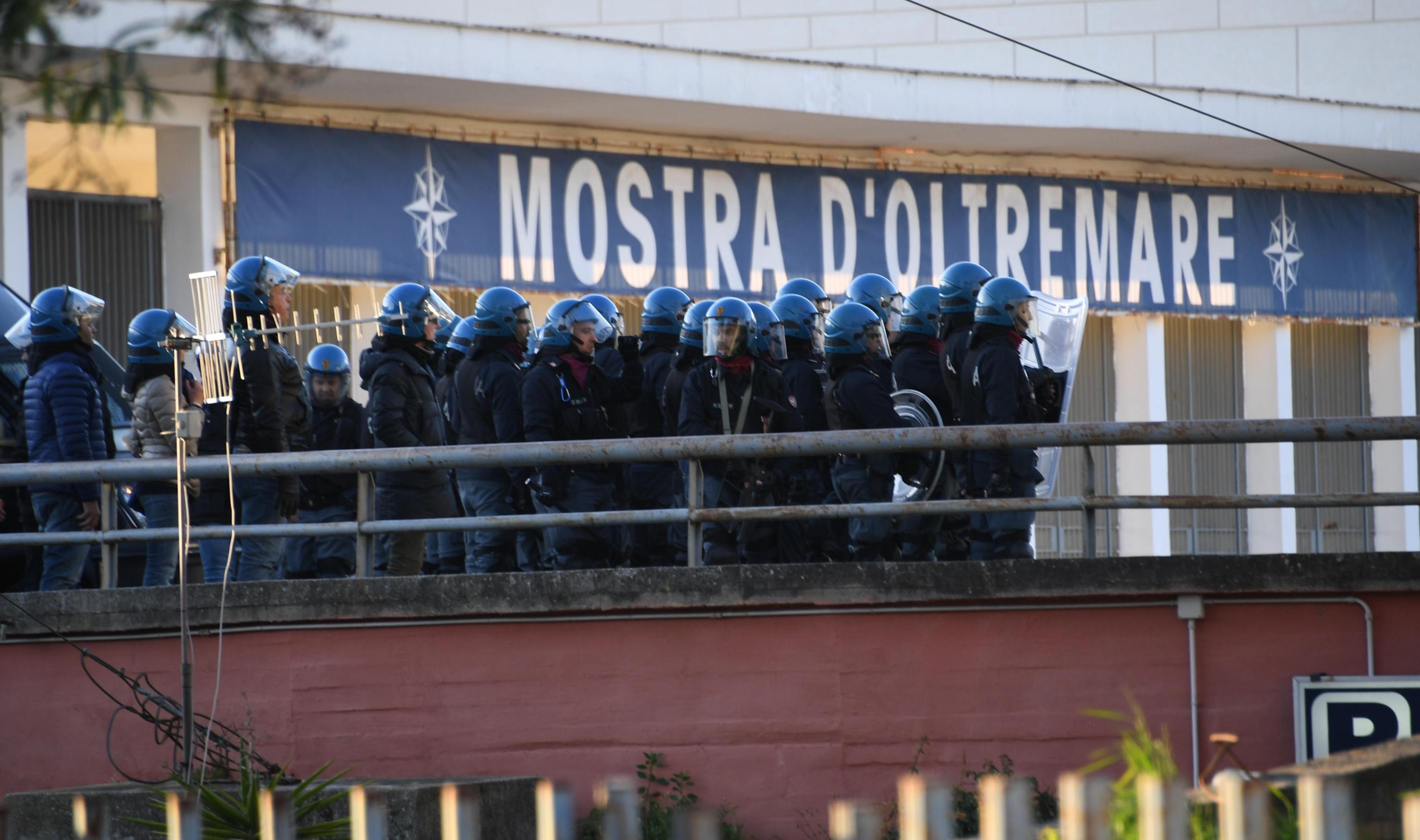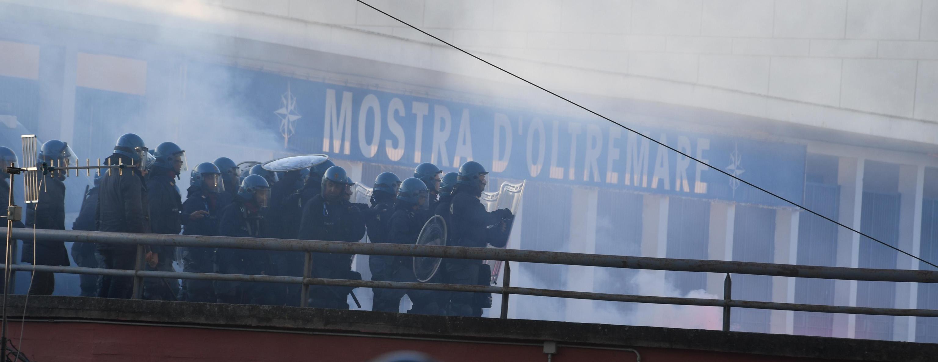 La violenza scatta quando la marea di manifestanti (oltre 5 mila per gli organizzatori, tra le due e le tremila unità per le forze dell’ordine) arriva davanti a quello che dovrebbe essere il capolinea del corteo, piazzale Tecchio, a poche decine di metri dall’ingresso della Mostra d’Oltremare dove nel frattempo è arrivato il leader della Lega. Agenti in assetto anti sommossa sbarrano le vie d’accesso all’ente fieristico.