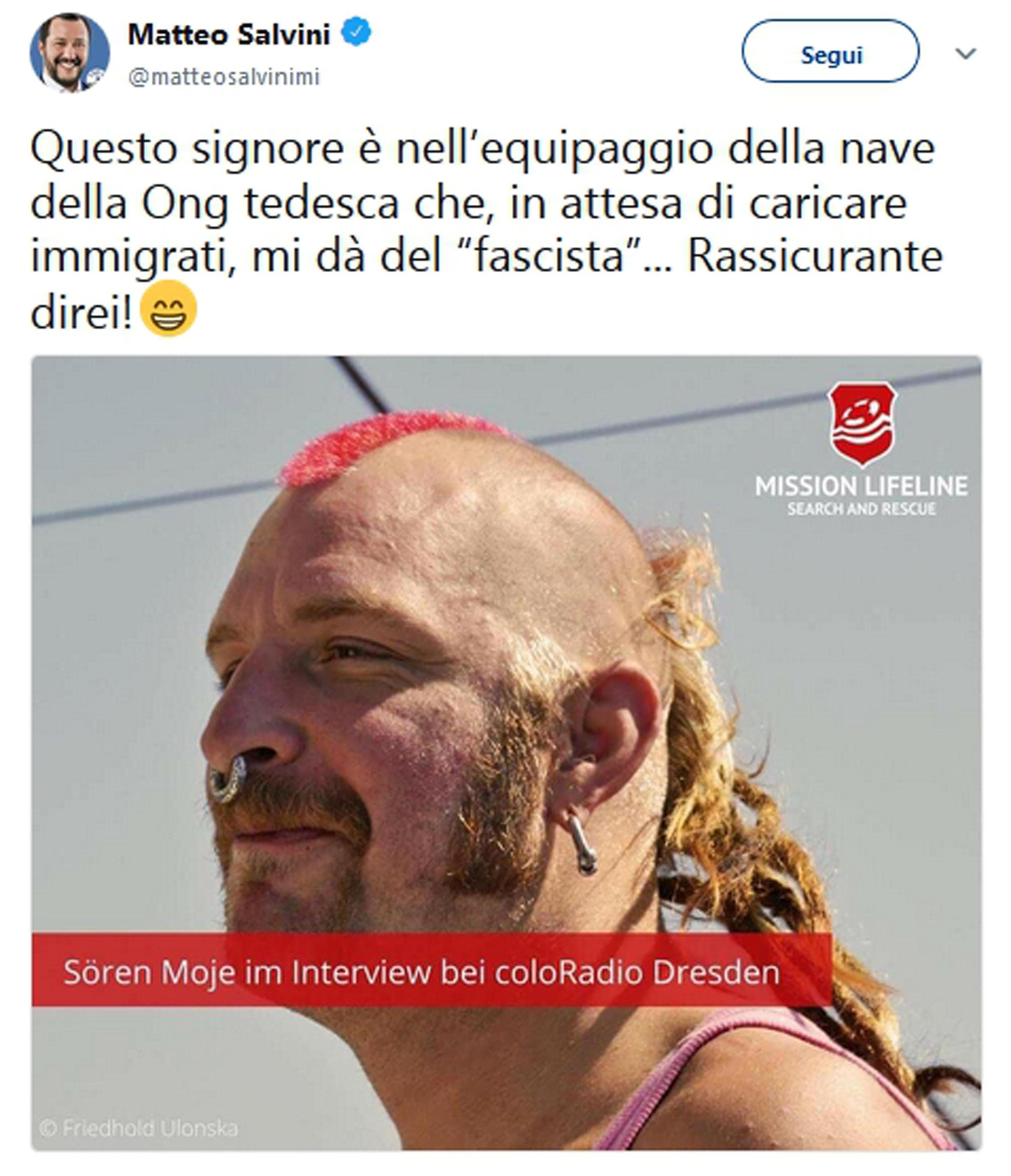 ROMA – “Questo signore è nell’equipaggio della nave della ong tedesca che, in attesa di caricare immigrati, mi dà del ‘fascista’… Rassicurante direi”, scriveva su twitter il Matteo Salvini, mostrando la foto di un uomo con orecchini, cresta colorata da mohicano e capelli a coda, che opera sulla nave della ong. [App di Blitzquotidiano, gratis, clicca qui,- Ladyblitz clicca qui –Cronaca Oggi, App on Google Play] Regalandogli il classico quarto d’ora di notorietà.