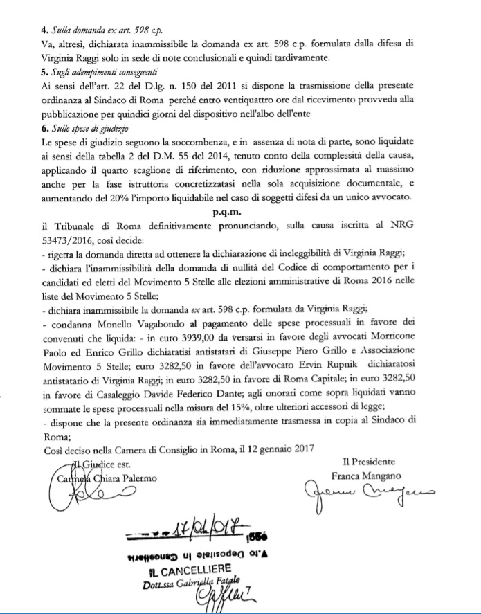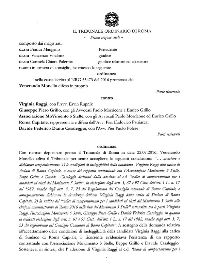 ROMA – Non ha vinto nessuno: né Virginia Raggi, né il codice M5S, né l’avvocato pd che ha fatto ricorso. La sentenza del tribunale civile di Roma, che ha respinto il ricorso di Venerando Monello sull’ineleggibilità del sindaco pentastellato di Roma non entra nel merito della costituzionalità del contratto che il Movimento 5 Stelle di “Giuseppe Piero Grillo” e “Davide Federico Dante Casaleggio” ha fatto firmare a chi è stato eletto (sindaco, consigliere o parlamentare) nelle sue file. Contratto che costringerebbe gli infedeli – cioè quelli che abbandonano M5S – a pagare una penale di 150 mila euro. Clicca qui e scarica il testo integrale della sentenza in Pdf
