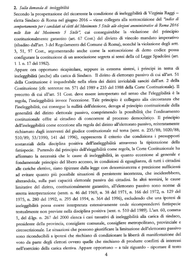 L’avvocato Monello aveva chiesto che la Raggi fosse dichiarata ineleggibile, perché costretta a governare sulla base di quel contratto, da considerarsi nullo e incostituzionale. I giudici gli hanno risposto che sebbene sia un diritto di “qualsiasi cittadino elettore” fare ricorso se ritiene che il proprio sindaco sia ineleggibile, la firma su un contratto come quello preparato da M5S per i suoi rappresentanti non rientra fra le cause di ineleggibilità. Si legge nella sentenza: