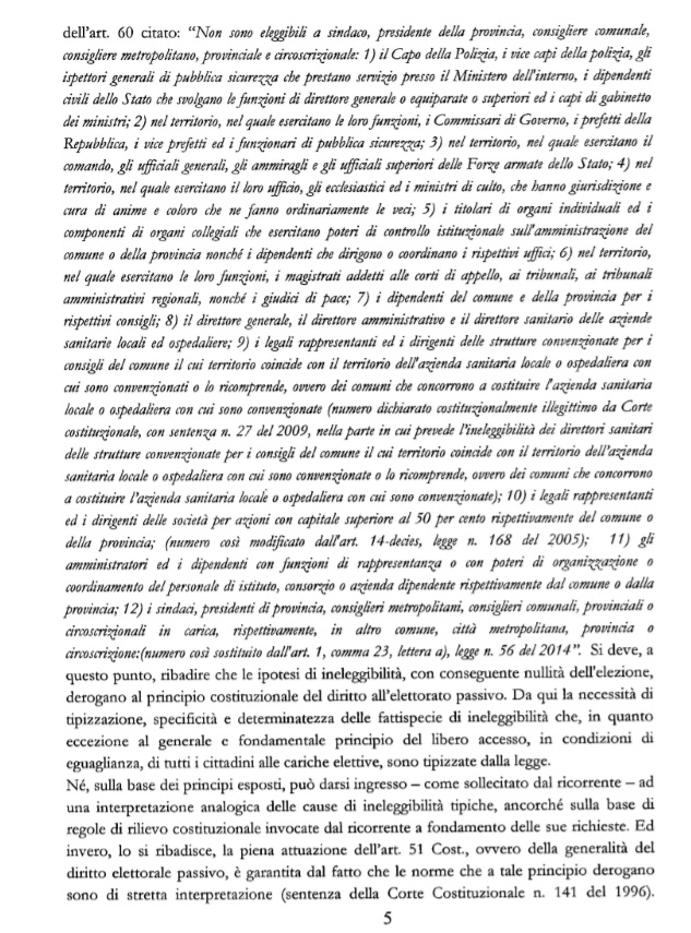 “L’art. 60, comma 1, del d.lgs. 267 del 200 elenca i casi di ineleggibilità alla carica di sindaco, presidente della provincia, consigliere comunale, consigliere metropolitano, provinciale e circoscrizionale. Le situazioni che possono giustificare la limitazione dell’elettorato passivo sono riconducibili a ipotesi che rischiano di condizionare la libertà di manifestazione del voto da parte degli elettori ovvero quelle che rischiano di produrre conflitti di interessi nell’esercizio della carica elettiva.”