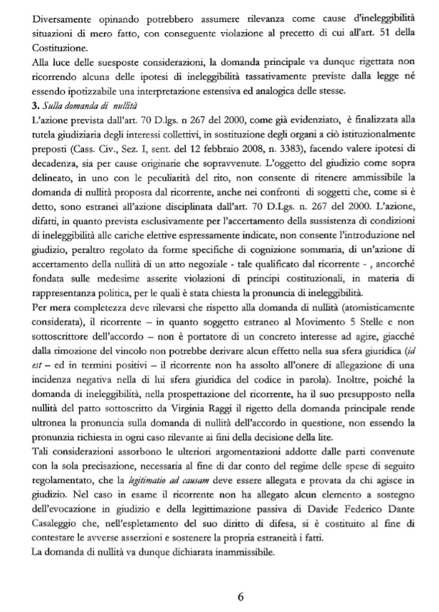 “Il ricorrente – in quanto soggetto estraneo al Movimento 5 Stelle e non sottoscrittore dell’accordo – non è portatore di un concreto interesse ad agire, giacché dalla rimozione del vincolo non potrebbe derivare alcun effetto nella sua sfera giuridica (id est – ed in termini positivi – il ricorrente non ha assolto all’onere di allegazione di una incidenza negativa nella di lui sfera giuridica del codice in parola). Inoltre, poiché la domanda di ineleggibilità, nella prospettazione del ricorrente, ha il suo presupposto nella nullità del patto sottoscritto da Virginia Raggi, il rigetto della domanda principale rende ultronea la pronuncia sulla domanda di nullità dell’accordo in questione, non essendo la pronunzia richiesta in ogni caso rilevante ai fini della decisione della lite”.
