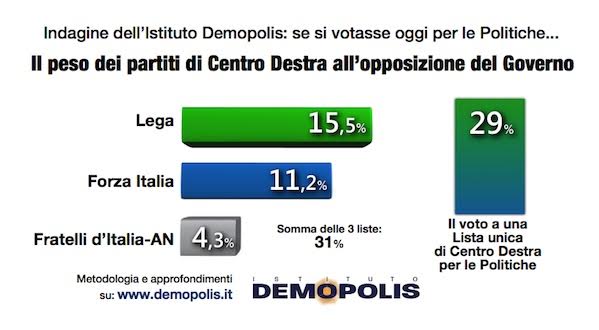 “L’Italicum, che porta al ballottaggio le prime due liste non favorisce lo schieramento di Centro Destra, diviso in 3 forze politiche differenti. Un’ipotetica lista unica si attesterebbe oggi al 29%, due punti sotto il peso complessivo dei singoli partiti”.