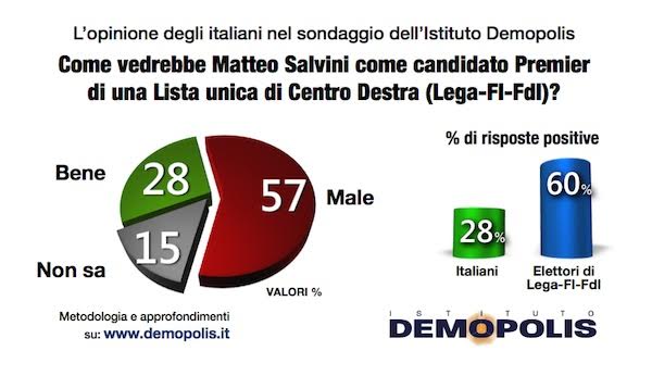Inoltre il 28% degli italiani vedrebbe bene Matteo Salvini come candidato premier di una lista unica “Lega-Forza Italia–Fratelli d’Italia”. Di parere opposto è il 57% degli intervistati. Il dato di apprezzamento di Salvini cresce significativamente al 60% tra chi oggi vota Centro Destra.