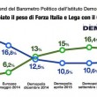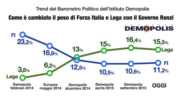 I mesi di governo Renzi hanno determinato un chiaro mutamento degli equilibri in seno all’area di Centro Destra, con un dimezzamento del peso elettorale del partito di Berlusconi, passato dal 23% del febbraio 2014 all’11,2% odierno. Inversamente proporzionale, secondo i trend del Barometro Politico Demopolis, appare l’evoluzione della Lega di Salvini, cresciuta in poco più di 20 mesi dal 3,8% al 15,5% di oggi.