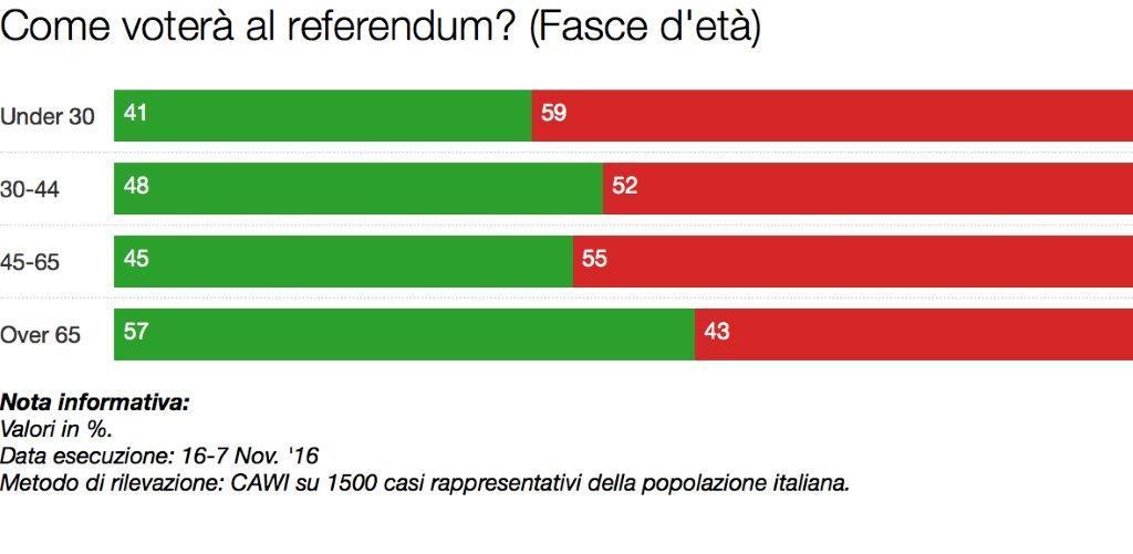 Nel rilevamento che si focalizza sulle fasce d’età, è infatti evidente come i più giovani fino ai 30 anni voteranno in gran parte No (59%). Tra chi ha dai 30 ai 44 anni prevale ancora chi si esprimerà contro la riforma costituzionale. Così come nella fascia che va dai 45 ai 65 anni. Mentre il Sì passa in testa (57%) tra gli over 65.
