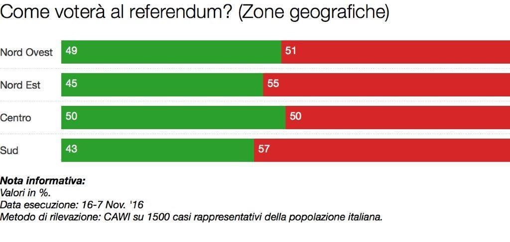 Per quanto riguarda la distribuzione geografica, il No si conferma ampiamente in testa al Sud (57%). Il sì è indietro anche al Nord-Est e al Nord-Ovest. Al Centro invece c’è il pareggio tra contrari e favorevoli.