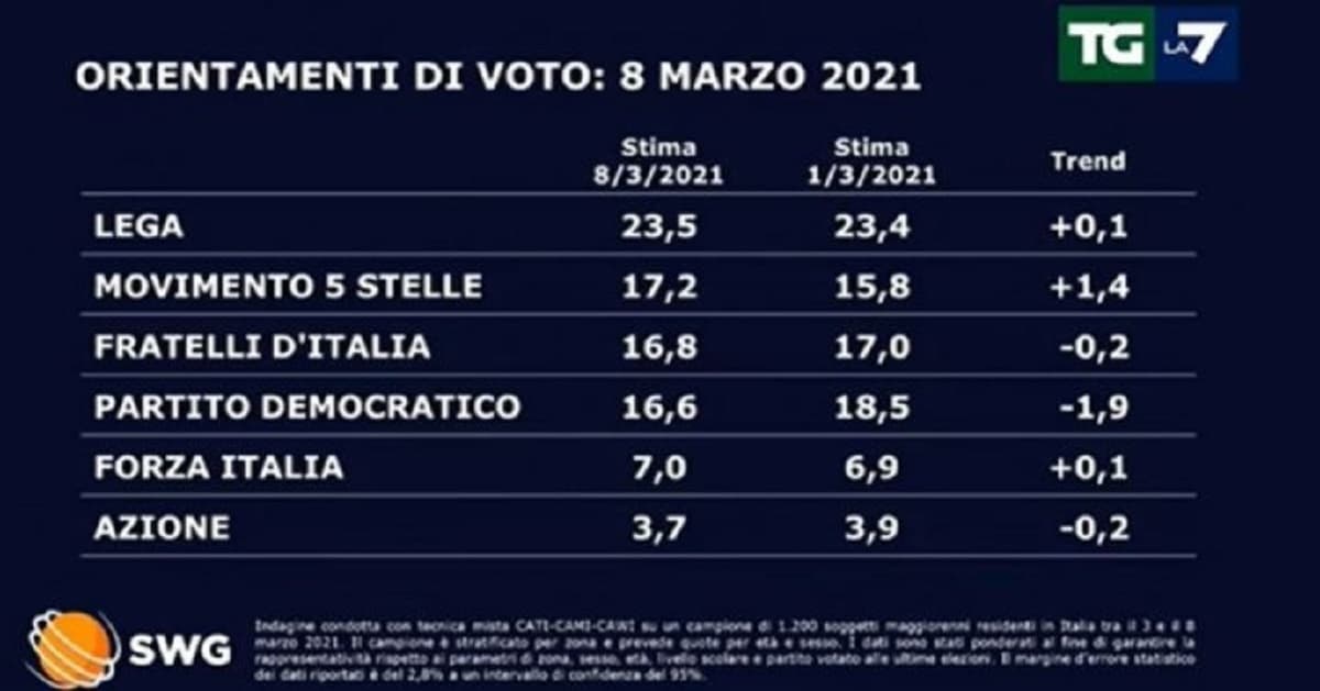 Il sondaggio Swg realizzato come ogni settimana per il Tg La7 conferma la Lega come primo partito, seguono in ripresa il Movimento 5 Stelle e terzo Fratelli d’Italia. Al quarto posto scivola il Pd, che paga forse le dimissioni di Nicola Zingaretti da segretario generale. Seguono forza Italia e Azione.