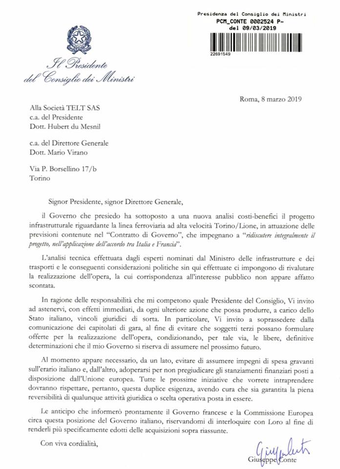 Il capolavoro di Conte è nella lettera da lui inviata, nella qualità di Presidente del Consiglio dei Ministri, al direttore generale di Telt, Mario Virano. Telt, è la società italo-francese incaricata di realizzare le opere per fare correre il Tav.