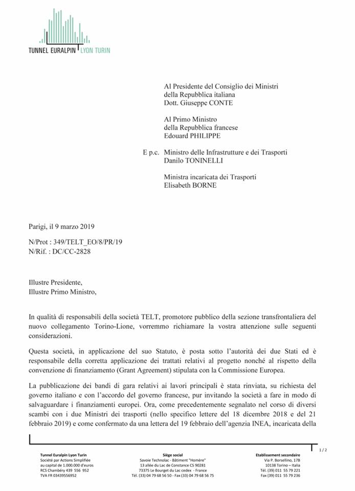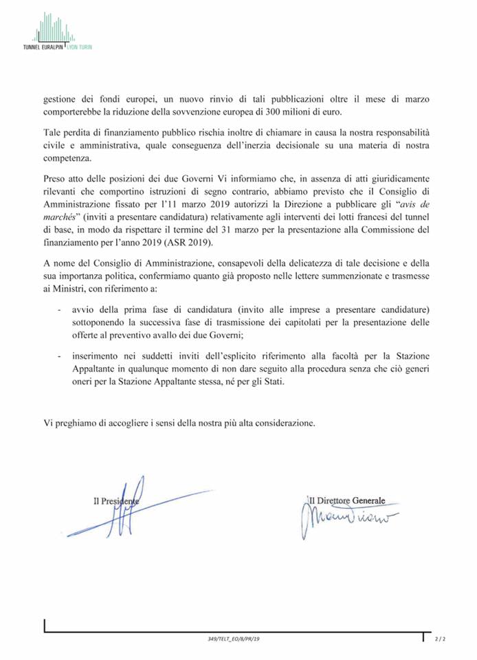 “In assenza di atti giuridicamente rilevanti che comportino istruzioni di segno contrario abbiamo previsto che il Cda fissato per l’11 marzo 2019 autorizzi la direzione a pubblicare gli ‘avis de marchés’ [“inviti a presentare candidatura” secondo la terminologia giuridica francese, in italiano i bandi] relativamente agli interventi dei lotti francesi del tunnel di base, in modo da rispettare il termine del 31 marzo” per avere il finanziamento Ue per il 2019. Si tratta di 45 chilometri, più 12 in territorio italiano.