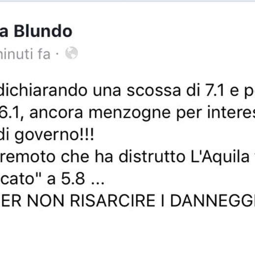 Blundo capisce la mala parata e cambia il suo messaggio lasciando il declassamento della magnitudo, ma limitandosi a criticare solo la “finzione mediatica” aggiungendovi la solidarietà alle popolazioni colpite. Retromarcia che però non basta neppure ai vertici pentastellati che con i capigruppo di Camera e Senato, Giulia Grillo e Luigi Gaetti, sconfessano la loro collega: “Il post della senatrice Blundo non rappresenta in alcun modo il pensiero dei gruppi parlamentari M5S di Camera e Senato e dell’intero Movimento” che – come preciserà poi in pomeriggio lo stesso Grillo – davanti a certe tragedie sente “con forza il senso di responsabilità a cui tutti siamo chiamati”.