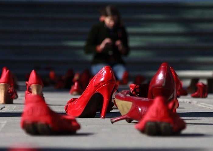 In una immagine di archivio Ansa, le scarpe rosse divenute simbolo della violenza di genere