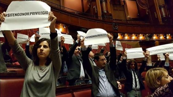 Poco prima i deputati M5s avevano interrotto il question time in diretta televisiva con il ministro dell’Ambiente Gianluca Galletti: hanno esposto cartelli sotto il banco della presidenza ed a quelli del governo con la scritta “#si tengono il privilegio”. Alcuni deputati M5S si sono seduti sui banchi del governo.