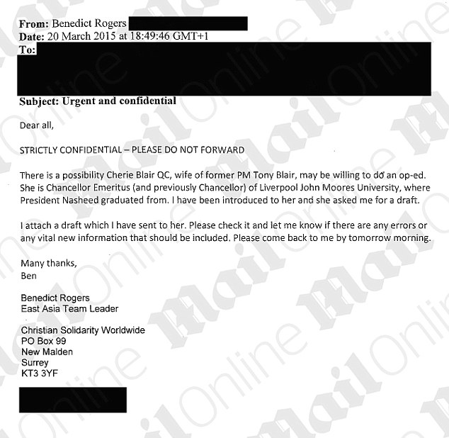 La Omnia ha dichiarato di aver preso “molto seriamente” la questione del ricevere denaro da qualcuno che non fosse suo cliente e sta urgentemente “revisionando” il pagamento. La società della Blair è stata ingaggiata dal Governo delle Maldive la scorsa estate, affermando che il suo ruolo era quello di promuovere la democrazia e la trasparenza. Ma dei documenti segreti ottenuti dal Mail rivelano che la compagnia era assunta per consigliare la “diplomazia strategica, la formazione dei media, [e] relazioni con i media internazionali “- e per gestire le pubbliche relazioni durante la battaglia legale del regime con l’ex presidente Mohamed Nasheed, che sostiene di essere stato costretto a lasciare l’ufficio nel 2012 minacciato con una pistola. Nasheed, rappresentato gratuitamente dal legale Amal Clooney -moglie di George Clooney-, venne poi condannato a 13 anni grazie a un processo definito da Amnesty International una “farsa”.