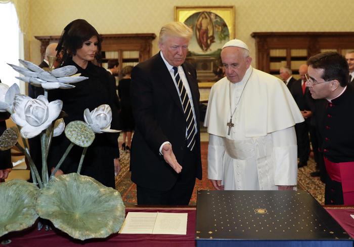 Melania Trump si è presentata all’incontro con il Pontefice stringendo un rosario tra le mani, con la richiesta al Papa di benedirlo. Francesco ha subito tracciato il segno della croce sulle mani della First Lady. Dopo lo scambio di regali ufficiali, il Papa ha benedetto anche altri rosari che gli sono stati portati su un vassoio e alla fine ha donato a tutti i presenti la medaglia del pontificato.