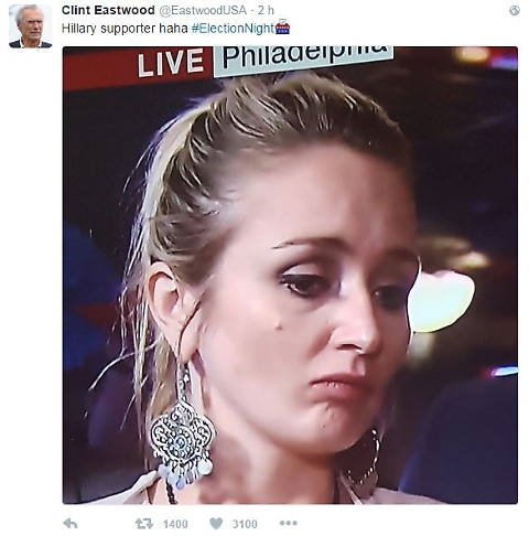 Nel primo tweet Eastwood si limita a scrivere “Hillary supporter, hahahaha”, ridendo letteralmente in faccia alla sostenitrice della Clinton. Poi preso dall’euforia il regista e star dei western scrive in un altro cinguettio: