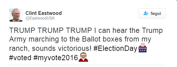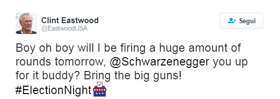 WASHINGTON – Donald Trump è il 45° presidente degli Stati Uniti e a osannarlo c’è un forte sostenitore dei repubblicani, Clint Eastwood, che su Twitter si lascia andare a cinguettii di gioia e soprattutto di scherno nei confronti degli elettori di Hillary Clinton. La fan della candidata democratica piange all’annuncio dei risultati in diretta tv e il regista e attore americano la deride in uno stato di euforia per la vittoria raggiunta, invitando anche Arnold Schwarzenegger ad “imbracciare i fucili”.