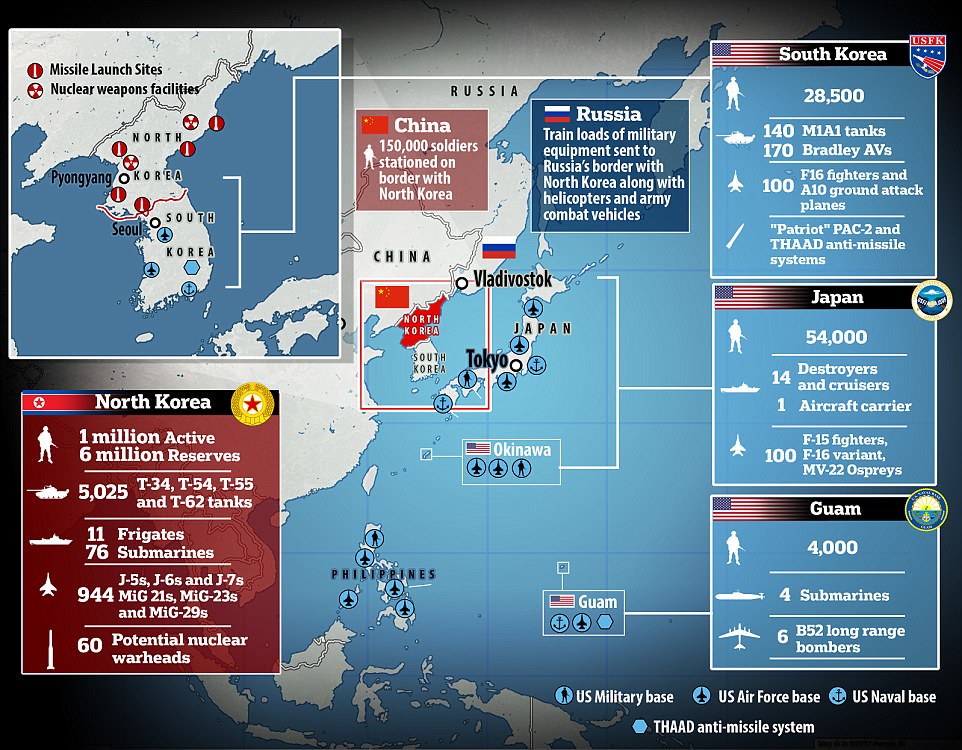 Il Giappone ospita circa 54.000 militari americani, dice il Dipartimento della Difesa Usa, e decine di migliaia di americani lavorano in entrambi i Paesi. Seul ospita una popolazione di circa 10 milioni di abitanti e lì è schierata una vasta gamma di razzi e artiglieria, impossibile da distruggere in un primo attacco degli Stati Uniti.