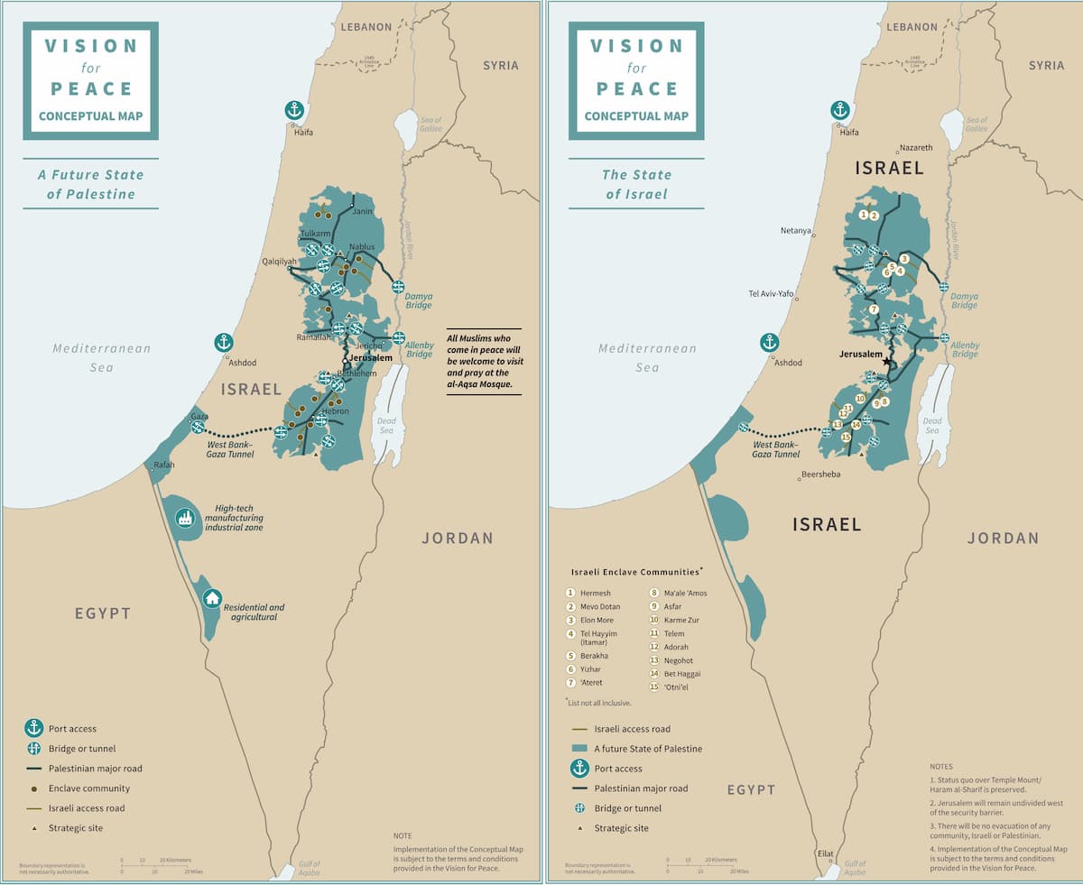 Trump ha annunciato che, se ci sarà l’accordo tra le parti sul piano di pace per il Medio Oriente, gli Usa apriranno un’ambasciata a Gerusalemme Est. Confermando così che quest’ultima potrebbe essere la capitale del futuro Stato palestinese. A corredo del piano lo stesso presidente Trump ha allegato su Twitter due mappe dei due futuri Stati.