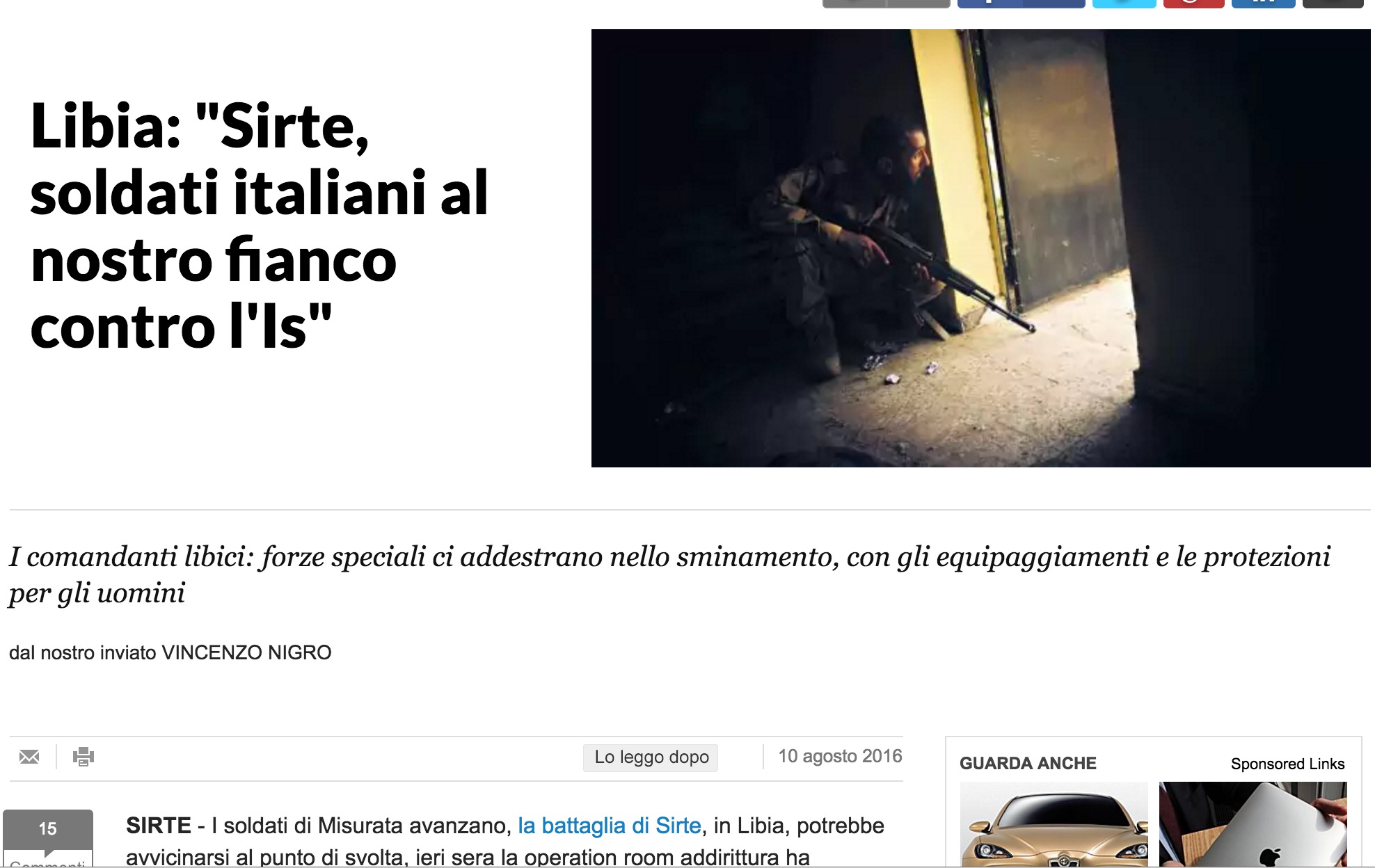 Il ruolo degli italiani nella guerra alle mine è davvero benedetto dai libici. La battaglia di Sirte è iniziata in maggio, adesso è entrata nella fase finale, ma Misurata è stremata. Più di 300 morti, 3.000 i feriti. I soldati della città -martire della rivoluzione contro Gheddafi sentono di combattere da soli contro i terroristi dello Stato Islamico. E i raid americani sono ancora troppo pochi, solo 28 da inizio agosto.