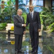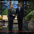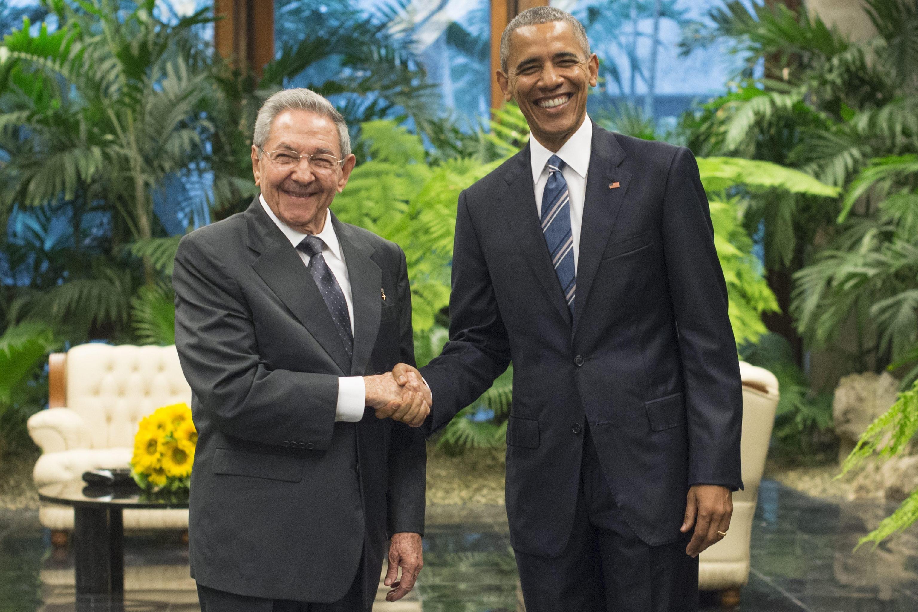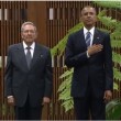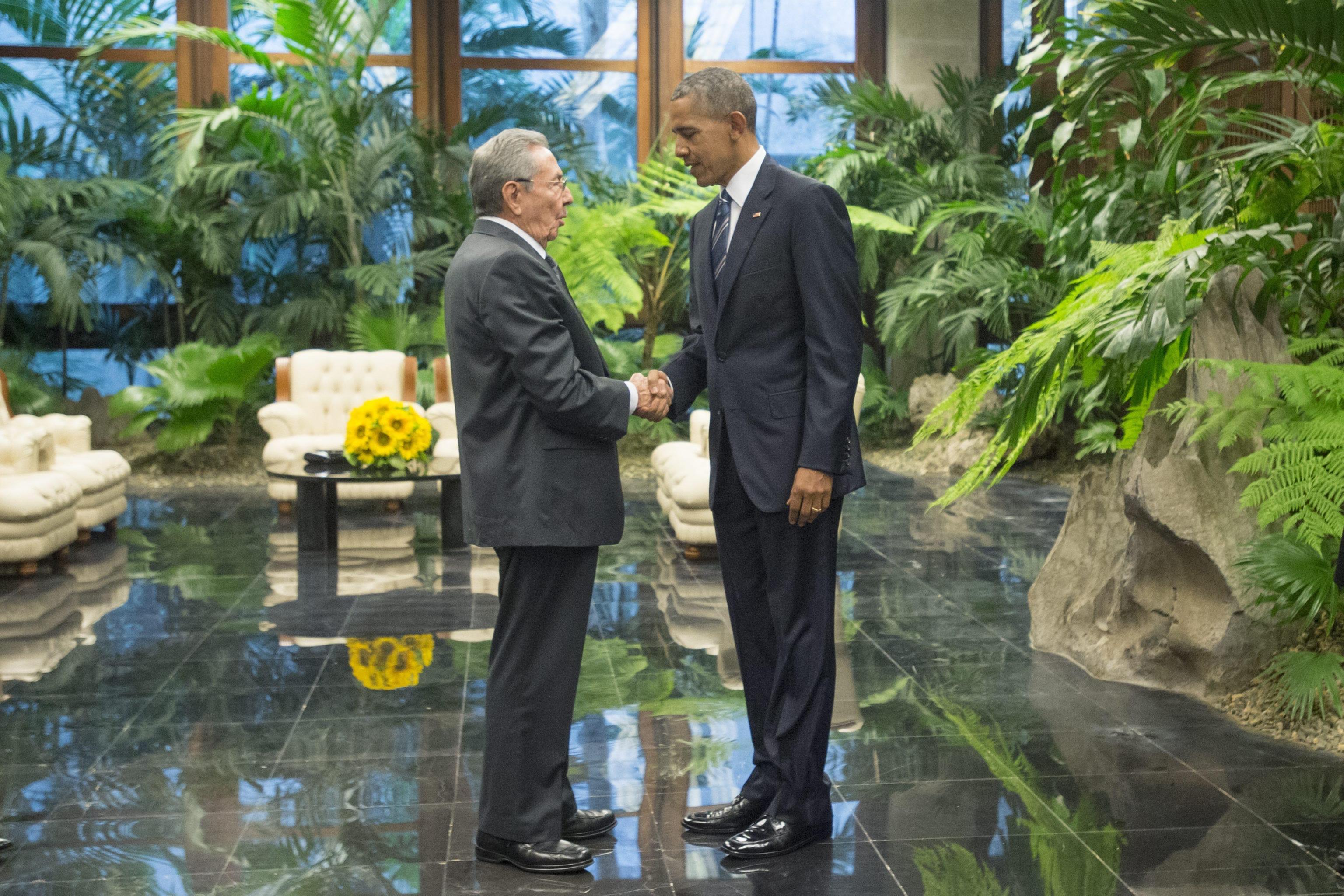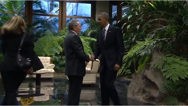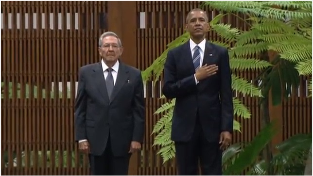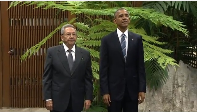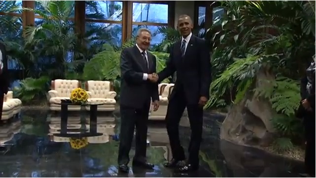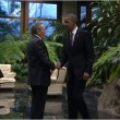 L’AVANA, CUBA – Obama-Castro: storica stretta di mano al Palazzo della Rivoluzione de L’Avana (FOTO E DIRETTA) fra il presidente degli Stati Uniti, Barack Obama, e il presidente cubano Raul Castro, fratello minore del “leader maximo” Fidel Castro. Storica stretta di mano tra il presidente cubano Raul Castro ed il presidente americano Barack Obama oggi al Palazzo della rivoluzione a L’Avana. La banda dell’esercito cubano ha eseguito i due inni nazionali. Per la prima volta l’inno americano è risuonato nel Palazzo della Rivoluzione. Obama è il primo presidente statunitense a rendere visita ufficiale a Cuba dopo Calvin Coolidge, che venne a L’Avana 88 anni fa.