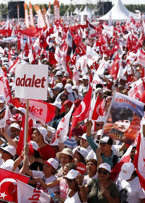 “Diritto, legge, giustizia”, è lo slogan che i manifestanti scandiscono di continuo, in lunghe code che nel primo pomeriggio iniziavano già diversi km prima di arrivare alla manifestazione. Il leader dell’opposizione ha parlato per un’ora sotto un sole cocente e ha lanciato la sfida di “riportare la giustizia in Turchia” dopo il “golpe civile del 20 luglio”, cioè le maxi-purghe decise con lo Stato d’emergenza, con oltre 50mila arresti e 150mila epurazioni. Kilicdaroglu ha ricordato che “in galera ci sono giornalisti e deputati” e ha invitato la Corte costituzionale a restare indipendente.