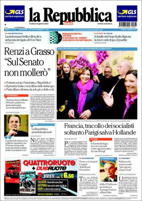 La prima pagina di La Repubblica: “Renzi a Grasso: sul Senato non mollerò”.