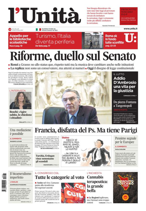 Era marzo a Roma quando un gruppo di senatori, circa sessanta narrano gli storici, mise in atto il complotto che portò alla morte di Giulio Cesare, divenuto troppo potente per i custodi della Repubblica. Le idi di marzo, appunto, si stanno ripetendo oltre duemila anni dopo. E, come allora, tra i complottisti si mischiano paure di tirannia, invidie e gelosie nei confronti dell’uomo vincente e amato dal popolo. Per questo la riforma che abolisce il Senato così come lo conosciamo oggi, decisa nell’incontro tra Renzi e Berlusconi, non si deve fare. Lo ha detto chiaro il presidente dei senatori Grasso ( dando probabilmente voce al pensiero di Napolitano) in un’intervista pubblicata ieri da La Repubblica subito sottoscritta da oltre venti senatori della sinistra e sulla quale converge una strana maggioranza che va da Grillo a Vendola. Proprio come il Cesare dell’antica Roma, ieri Renzi ha replicato stizzito: «Voi difendete solo lo status quo », lasciando intendere che oggi il governo varerà comunque il disegno di legge per l’abolizione. Che rimarrà carta straccia fino all’approvazione dei due rami del Parlamento. Cioè, temo, per sempre.