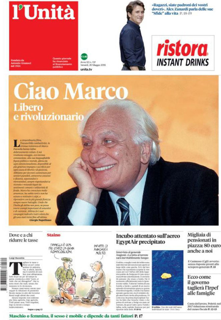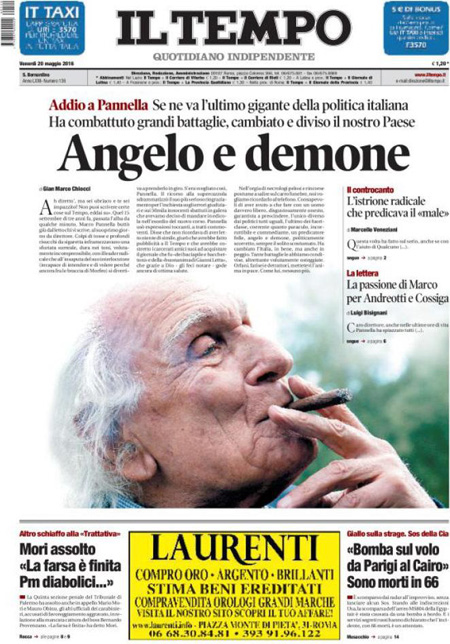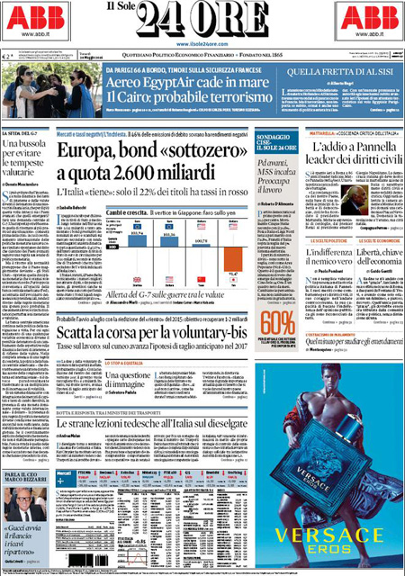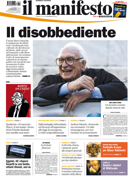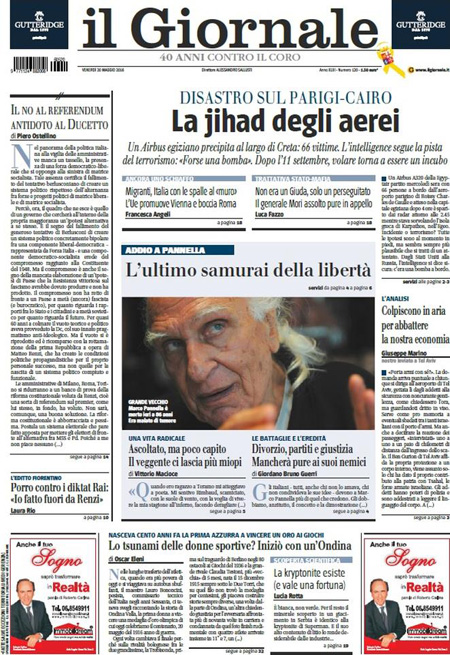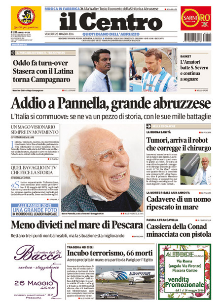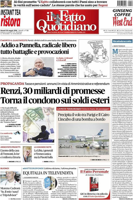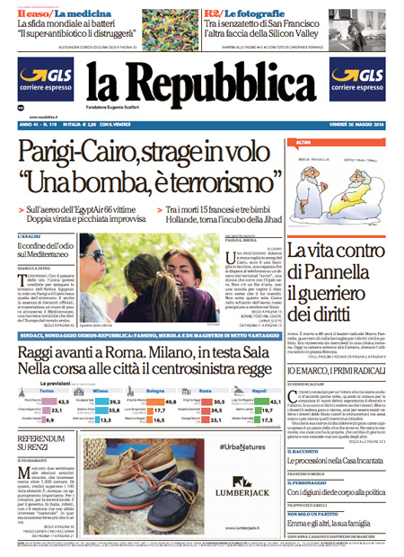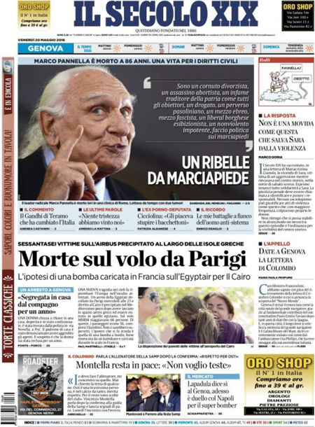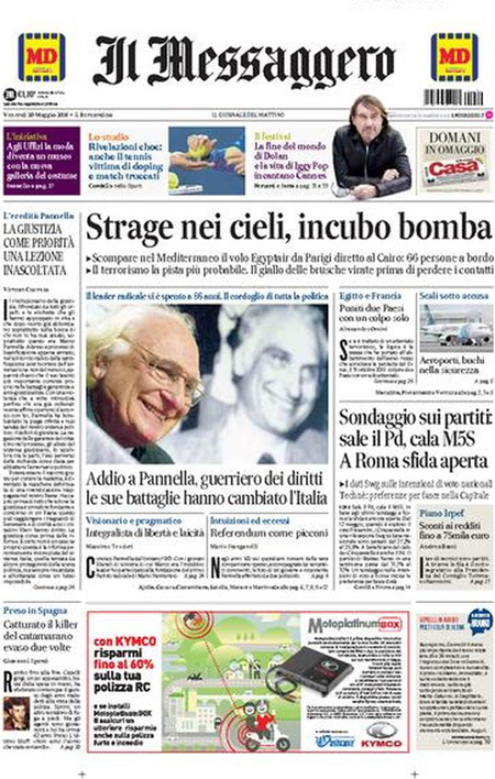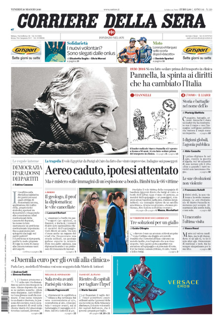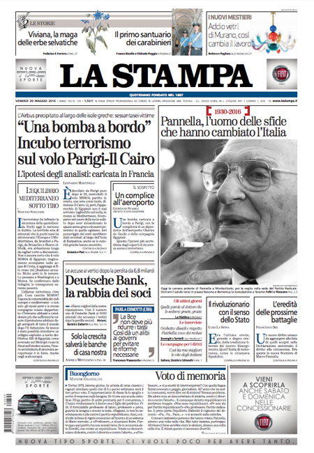 ROMA – Queste le prime pagine dei giornali di venerdรฌ 20 maggio. La prima pagina de La Stampa: “Una bomba a bordo. Incubo terrorismo sul volo Parigi-Il Cairo”. La prima pagina del Corriere della Sera: “Pannella, la spinta ai diritti che ha cambiato l’Italia”. La prima pagina de La Repubblica: “Parigi-Cairo, strage in volo”.