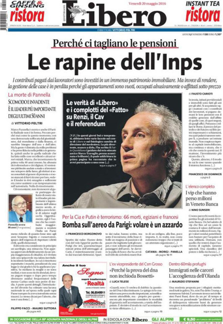 La prima pagina del Messaggero: “Strage nei cieli, incubo bomba”. La prima pagina di Libero: “Perchรฉ ci tagliano le pensioni. Le rapine dell’Inps”.ย Queste le prime pagine dei giornali di venerdรฌ 20 maggio.