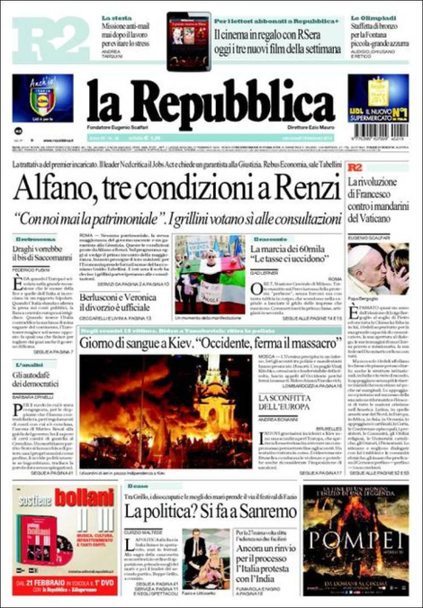 Le condizioni di Alfano a Renzi “La maggioranza non può cambiare e se c’è la patrimoniale noi usciamo”. La Repubblica: “Cuperlo: garanzie sull’economia. Oggi vertice di coalizione”