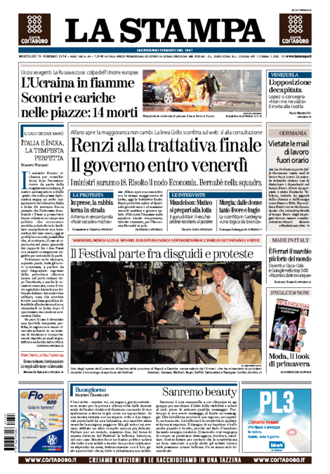 Marco Venturi, presidente di Rete imprese italia e di Confesercenti: «Andiamo in piazza perché non ce la facciamo più». Il governo e il Parlamento «devono prendere atto che, fuori dalle stanze della politica, c’è un Paese che sta soffrendo». Renzi, una volta insediato, «deve convocarci immediatamente » per affrontare i temi più urgenti: il «fisco, che spinge imprese a chiudere perché non ce la fanno più. Va riformato e ridotto. Poi la pubblica amministrazione, la semplificazione».