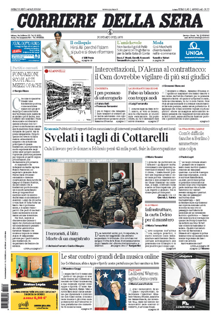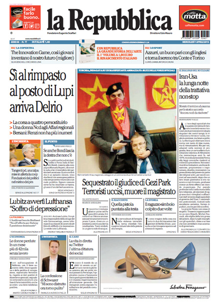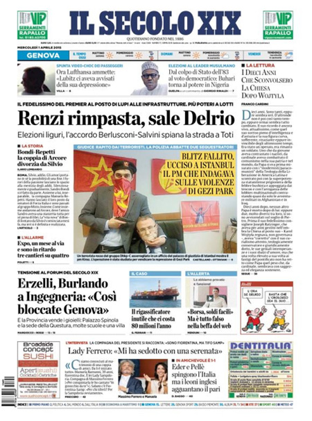 Il Corriere della Sera si occupa di Massimo D’Alema e delle intercettazioni che lo riguardano nelle indagini sul sindaco di Ischia, mentre altri aprono con il blitz in Turchia per liberare un giudice sequestrato da due terroristi e l’ammissione da parte di Lufthansa di essere stata informata della depressione del copilota Andreas Lubitz del volo Germanwings.