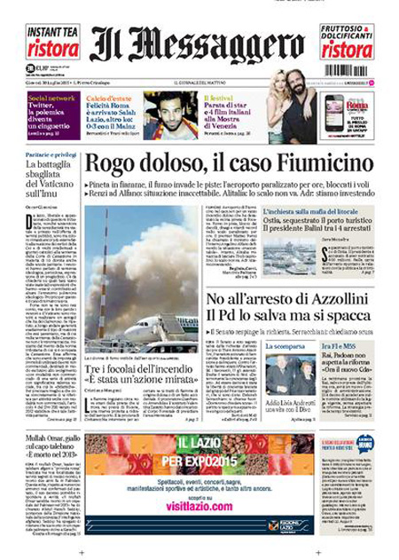 Altra notizia in prima pagina è l’incendio in una pineta poco lontano dall’aeroporto di Fiumicino, che ieri ha causato la sospensione dei voli per alcune ore; viene dato anche spazio alla notizia della morte del Mullah Omar, storico leader dei talebani.