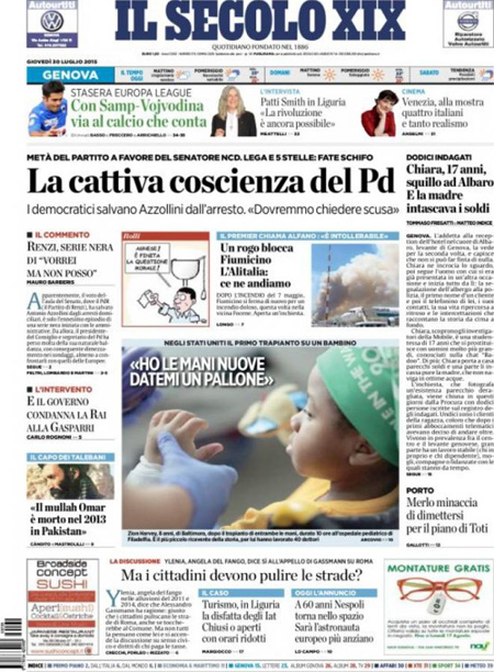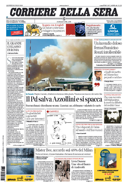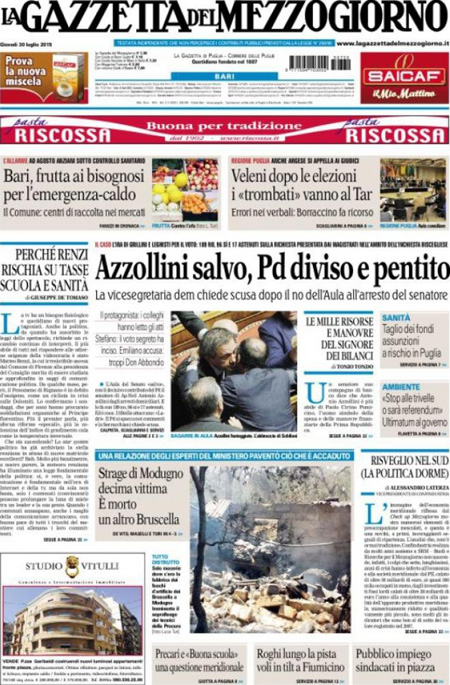 ROMA – I principali giornali italiani oggi, 30 luglio, dedicano l’apertura alla decisione presa ieri dal Senato di respingere la richiesta di arresto del senatore NCD Antonio Azzollini presentata dalla procura di Trani. La questione ha causato molti problemi soprattutto nel PD: la giunta per le immunità del Senato aveva votato a maggioranza per autorizzare l’arresto e anche il presidente del partito Matteo Orfini aveva chiesto di votare per l’arresto, ma molti senatori hanno deciso diversamente.