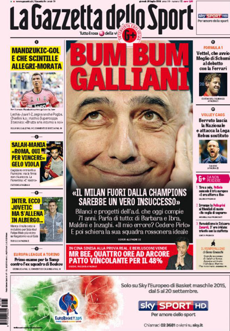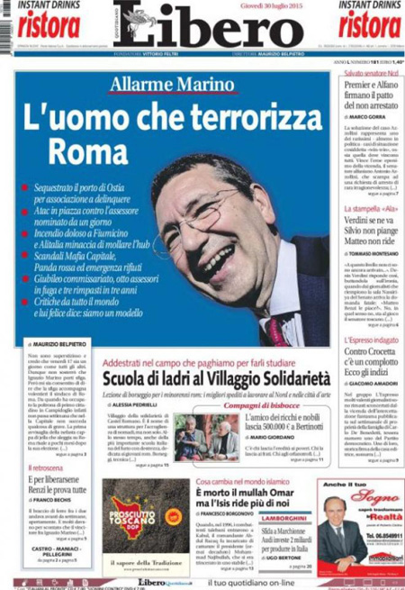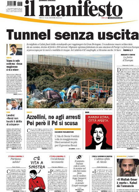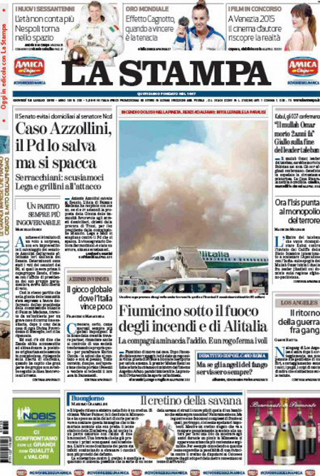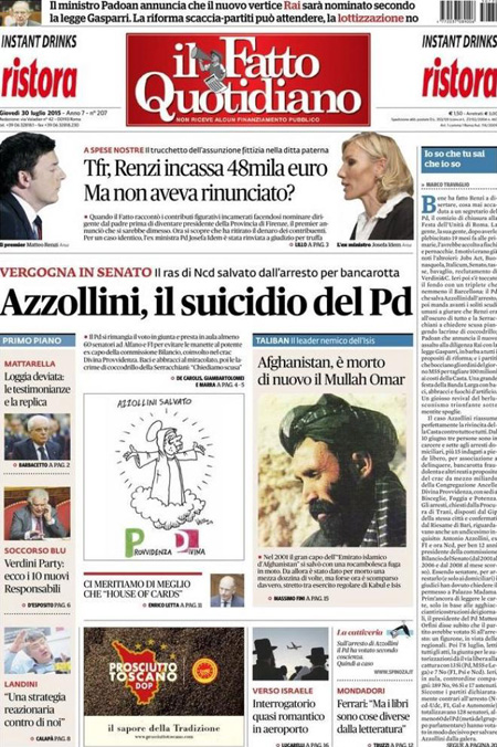 Altra notizia in prima pagina è l’incendio in una pineta poco lontano dall’aeroporto di Fiumicino, che ieri ha causato la sospensione dei voli per alcune ore; viene dato anche spazio alla notizia della morte del Mullah Omar, storico leader dei talebani.