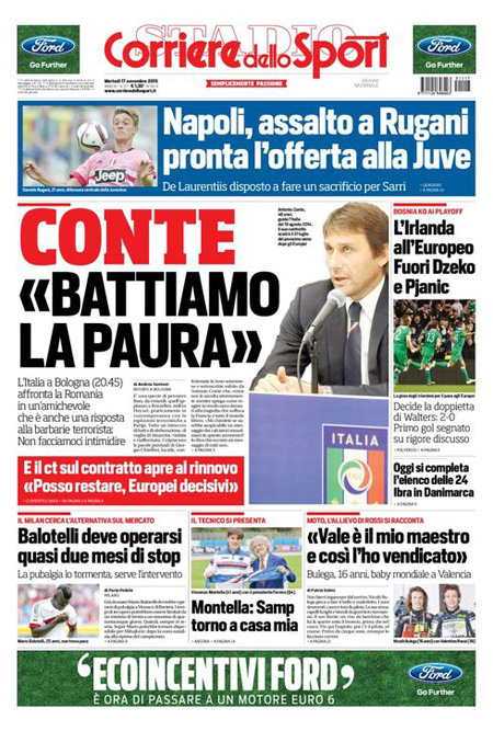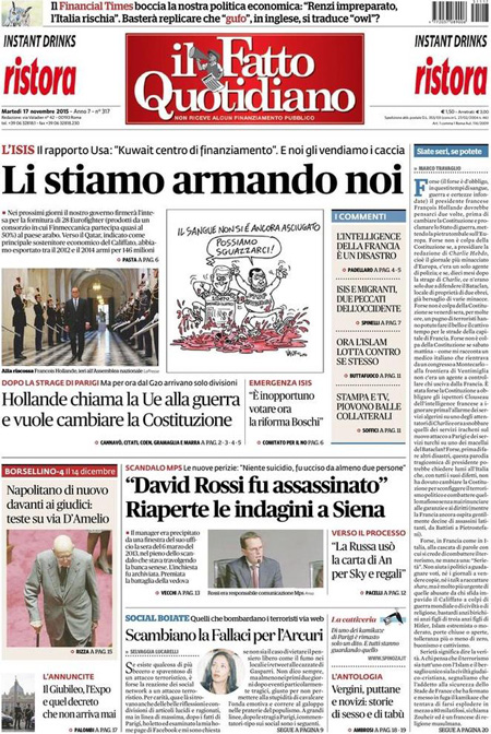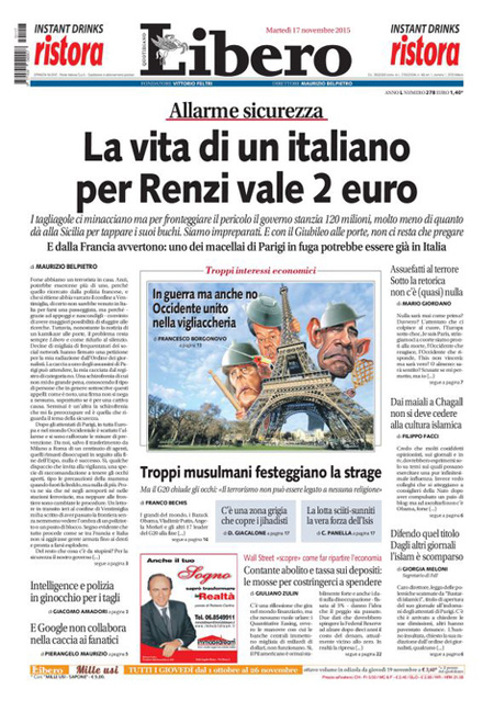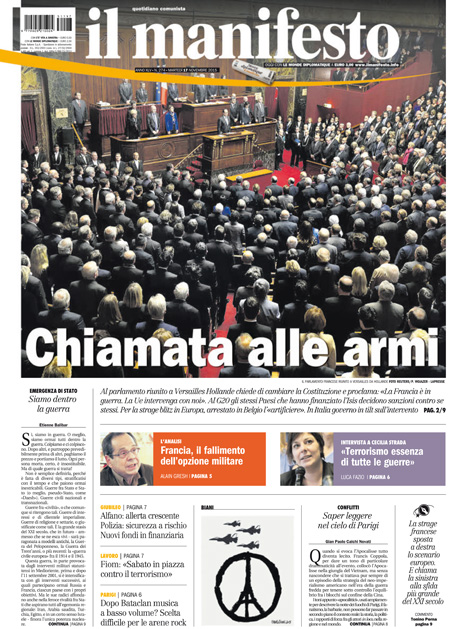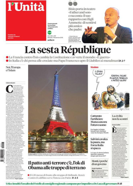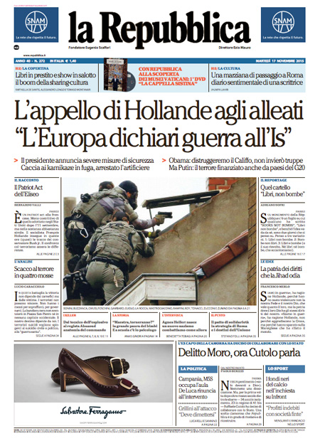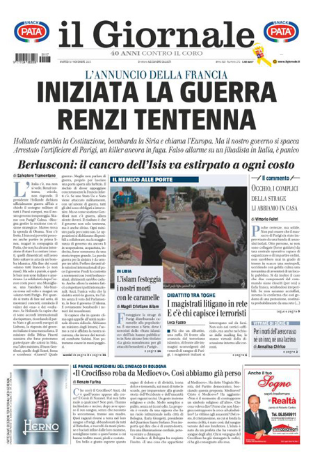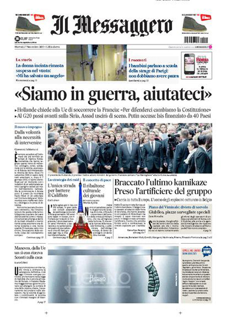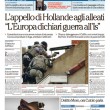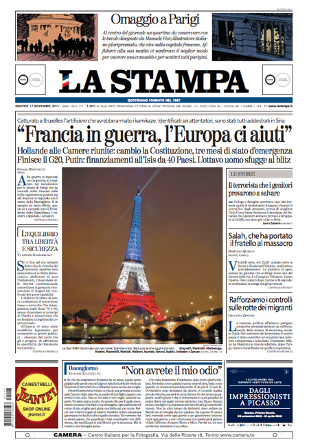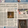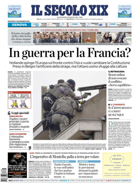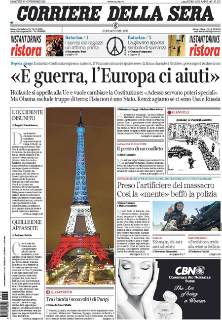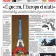 ROMA – Tutti i giornali seguono anche oggi, 17 novembre, le notizie sugli attentati di Parigi, e quasi tutti i titoli si concentrano sul discorso tenuto dal Presidente francese Hollande di fronte al Parlamento riunito eccezionalmente ieri a Versailles, durante il quale ha detto che la Francia è in guerra con l’ISIS e che vuole cambiare la costituzione per affrontare meglio la guerra, e ha poi chiesto ai paesi occidentali il loro aiuto in questo scontro.