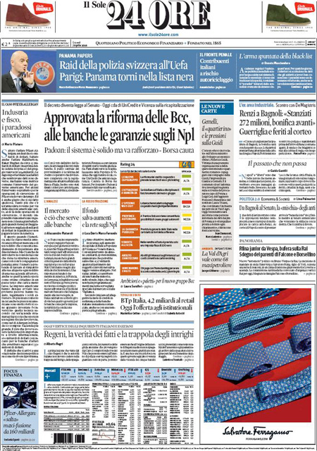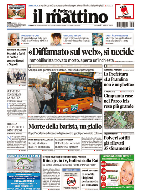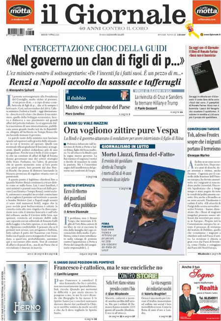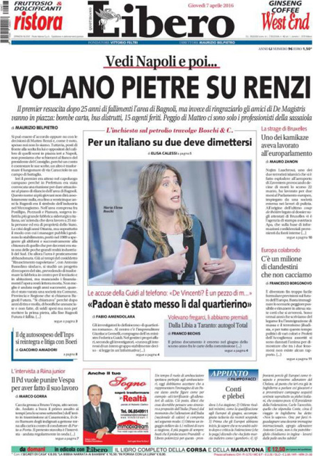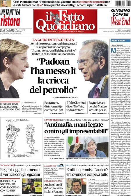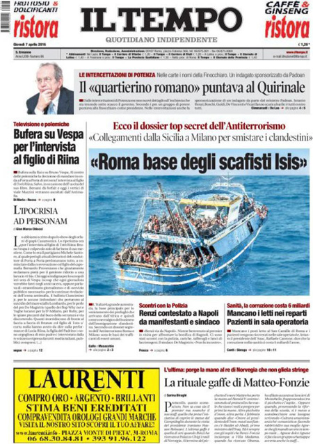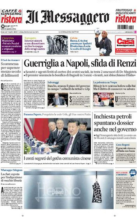 La prima pagina del Messaggero: “Guerriglia a Napoli, sfida di Renzi. Scontri e feriti al corteo dei centri sociali, in testa due assessori di De Magistris. Il premier annuncia la bonifica di Bagnoli in 3 anni”. La prima pagina del Giornale: “L’intercettazione choc della Guidi: nel governo un clan di figli di p…”. La prima pagina del Fatto Quotidiano: “La Guidi intercettata: Padoan ha messo lรฌ la cricca del petrolio”.ย Queste le prime pagine dei giornali di giovedรฌ 7 aprile.