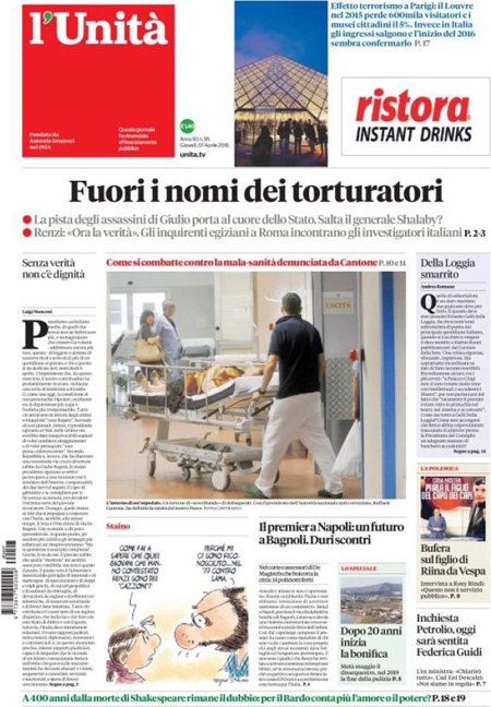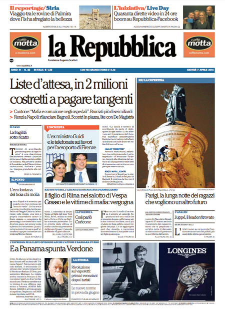 ROMA – Queste le prime pagine dei giornali di giovedรฌ 7 aprile. La prima pagina de La Stampa: “Petrolio, lo scontro fra il clan Gemelli e gli uomini di Renzi”. La prima pagina del Corriere della Sera: “Assessori in piazza e scontri a Napoli. Renzi: vado avanti. De Magistris diserta”. La prima pagina de La Repubblica: “Lista d’attesa, in 2 milioni costretti a pagare tangenti. Cantone: mafia e corruzione negli ospedali. Bruciati piรน di sei miliardi”.