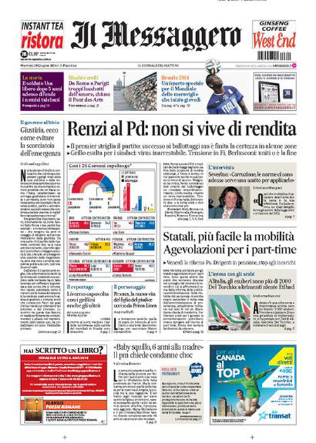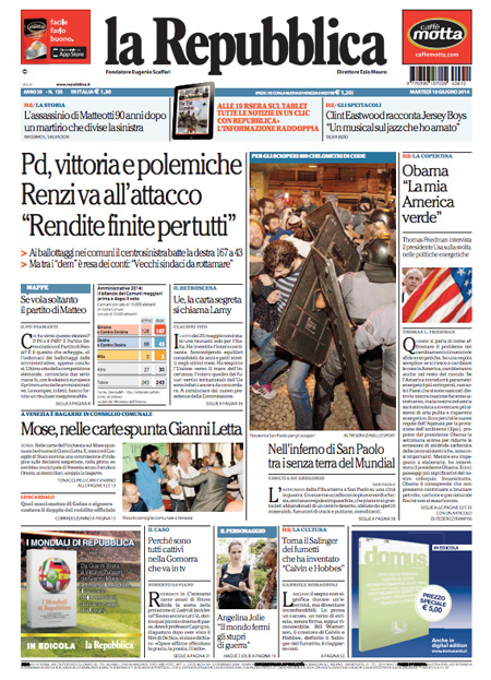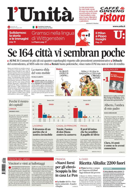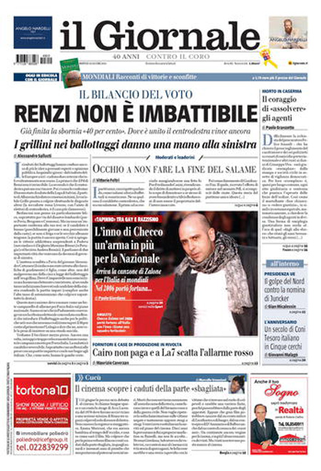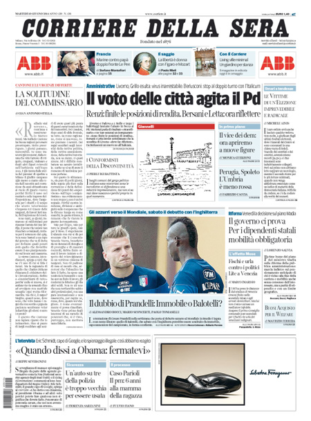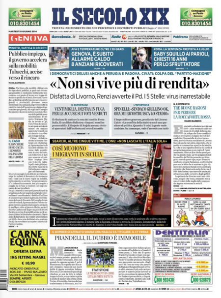 ROMA – L’analisi dei risultati dei ballottaggi per l’elezione dei sindaci svoltisi domenica 8 giugno, è sull’apertura dei quotidiani nazionali, che si concentrano sulle parole di Matteo Renzi, che ha detto che il PD non può “vivere di rendita” per mantenere le città dove ha sempre governato, e sul nuovo sindaco di Livorno del Movimento 5 Stelle Filippo Nogarin.