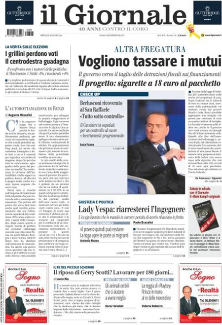 La prima pagina del Manifesto: “Guerre stellari”. La prima pagina del Giornale: “Vogliono tassare i mutui”. La prima pagina di Libero: “Il cuore matto di Silvio”. La prima pagina del Fatto Quotidiano: “E’ il governo della minoranza”.ย Queste le prime pagine dei giornali di mercoledรฌ 8 giugno.