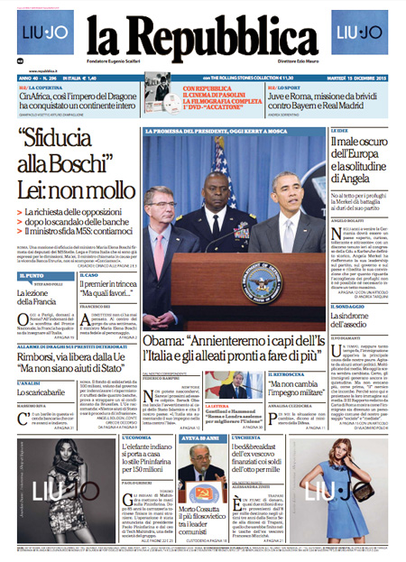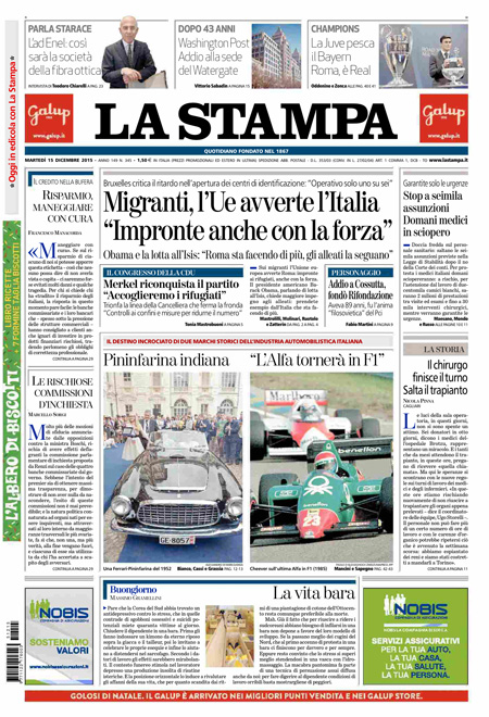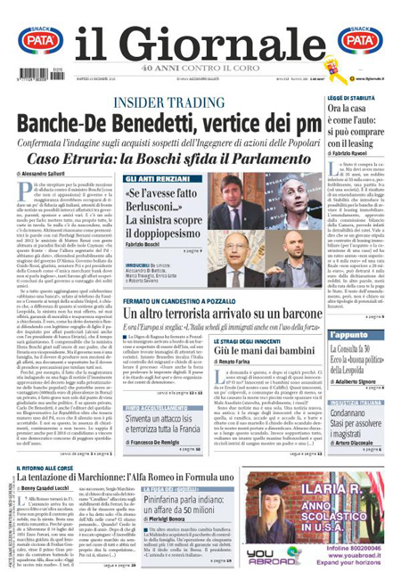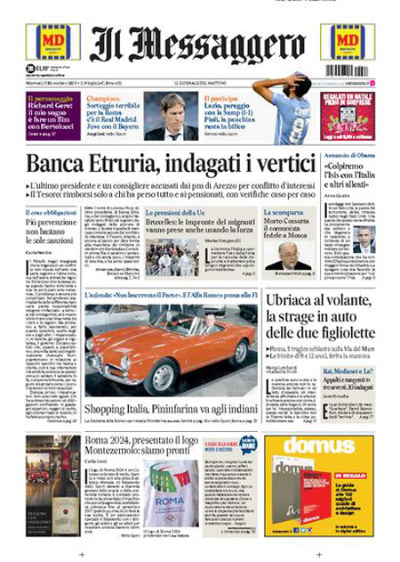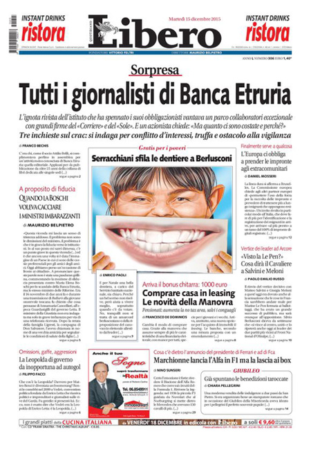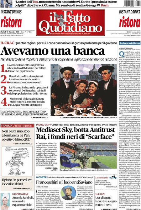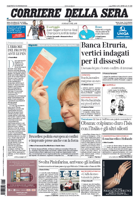 ROMA – Sui quotidiani di oggi, 15 dicembre, ci sono notizie diverse in apertura: molti seguono ancora la vicenda di Banca Etruria, con i primi provvedimenti della magistratura e la mozione di sfiducia presentata dal Movimento 5 Stelle per il ministro Boschi, altri aprono invece con la richiesta dell’Unione Europea all’Italia di accelerare l’apertura dei centri di identificazione per i migranti.