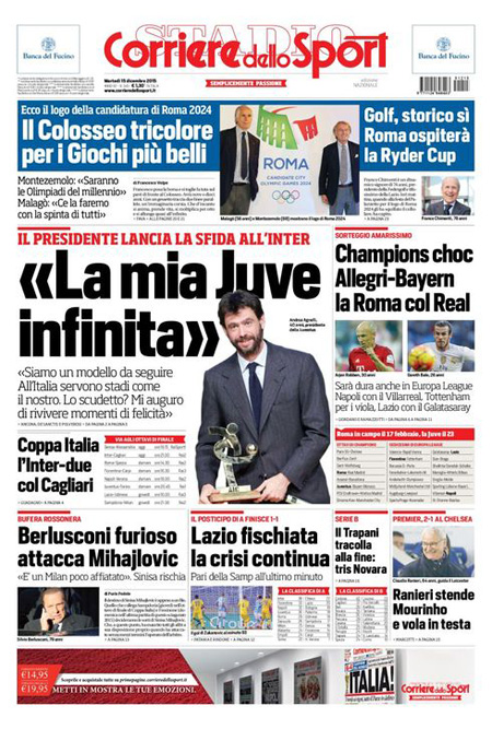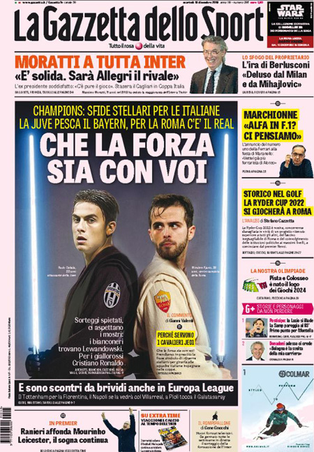 I quotidiani sportivi titolano sui sorteggi degli ottavi di Champions League, con la Juventus contro il Bayern e la Roma contro il Real Madrid.