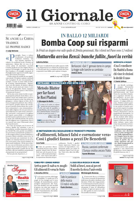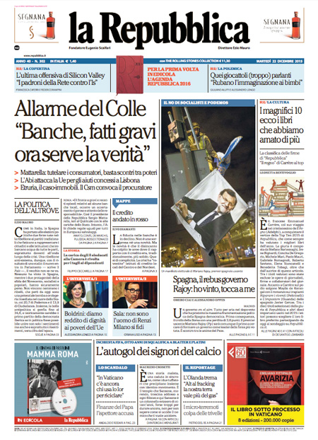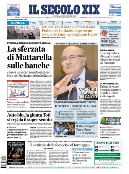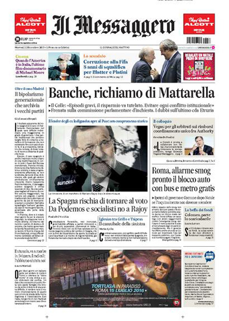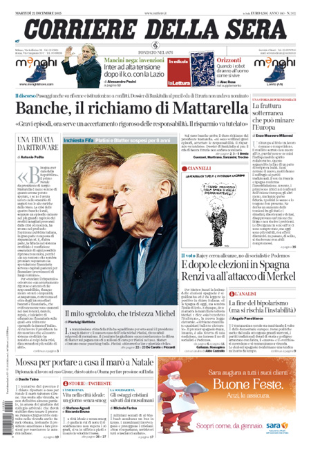 ROMA – Per la maggior parte dei giornali di oggi, 22 dicembre, la notizia di apertura è l’intervento sulla vicenda delle banche del Presidente della Repubblica Mattarella, che ha chiesto una maggiore collaborazione fra le istituzioni per l’accertamento delle responsabilità.