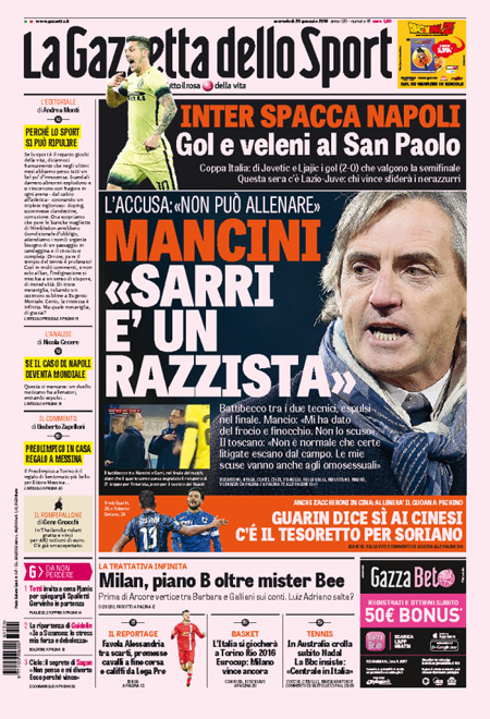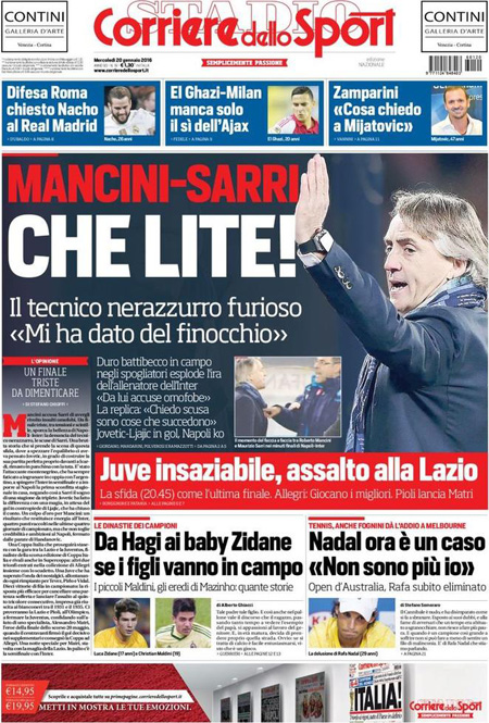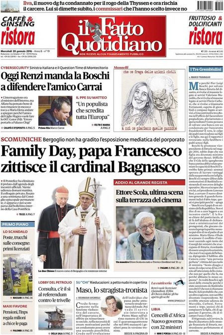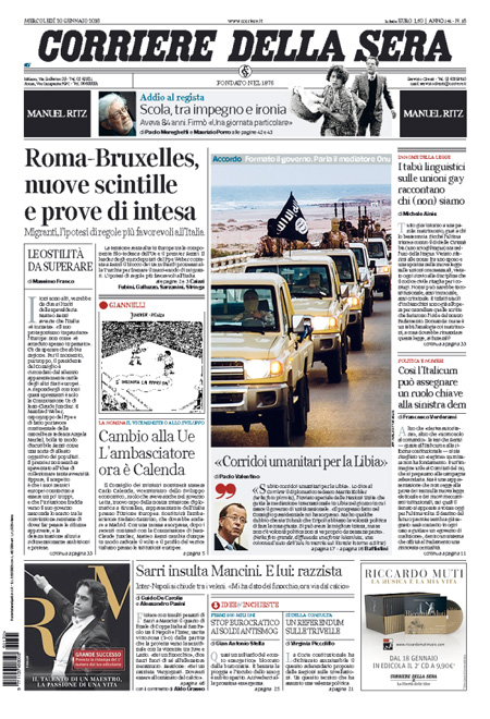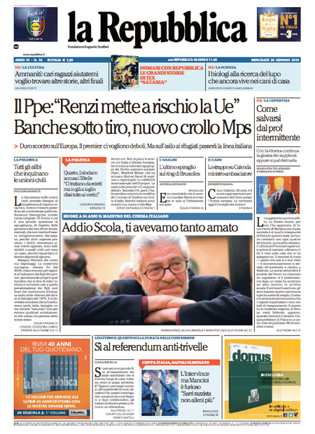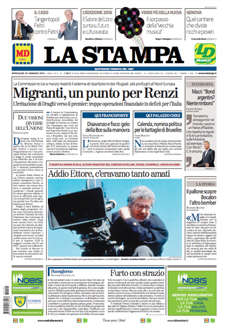 ROMA – Queste le prime pagine dei giornali di mercoledì 20 gennaio. La prima pagina de La Stampa: “Migranti, un punto per Renzi. L’irritazione di Draghi verso il premier: troppe operazioni finanziarie in deficit per l’Italia”. La prima pagina del Corriere della Sera: “Roma-Bruxelles, nuove scintille e prove d’intesa. Migranti, l’ipotesi di regole più favorevoli all’Italia”. La prima pagina de La Repubblica: “Il Ppe: Renzi mette a rischio l’Ue. Banche sotto tiro, nuovo crollo Mps. Duro scontro sull’Europa. Il premier: ci vogliono deboli. Ma sull’asilo ai rifugiati passerà la linea italiana”. La prima pagina del Sole 24 Ore: “Copertura dei crediti deteriorati: Italia meglio della media europea. Il tasso di copertura delle banche quotate supera quello dei big europei”.