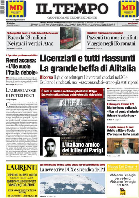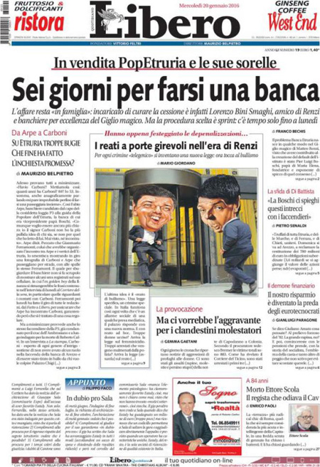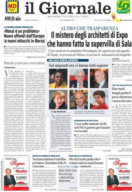 La prima pagina del Messaggero: “Sfida alla Ue, la mossa di Renzi. L’uomo della Mekel nel Ppe attacca il premier: mette a rischio la credibilità dell’Europa”. La prima pagina del Giornale: “Altro che trasparenza. Il mistero degli architetti di Expo che hanno fatto la supervilla a Sala. E per assolvere il candidato Pd indagato (in segreto) per gli appalti di Eataly, la procura di Milano si inventa le attenuanti psicologiche”. La prima pagina di Libero: “In vendita PopEtruria e le sue sorelle. Sei giorni per farsi una banca”. Queste le prime pagine dei giornali di mercoledì 20 gennaio.