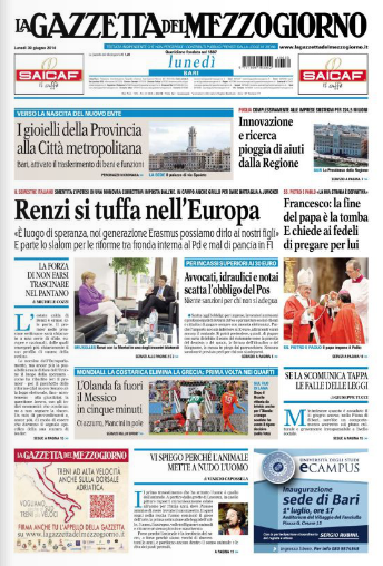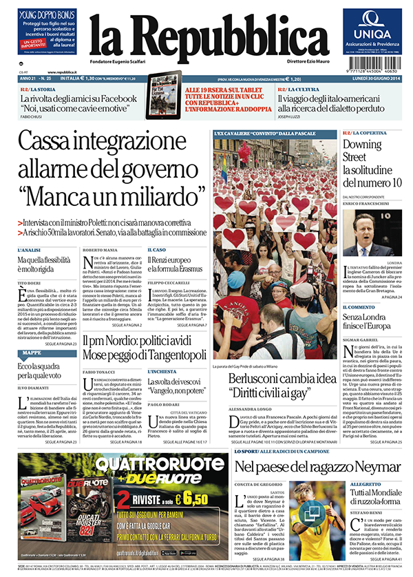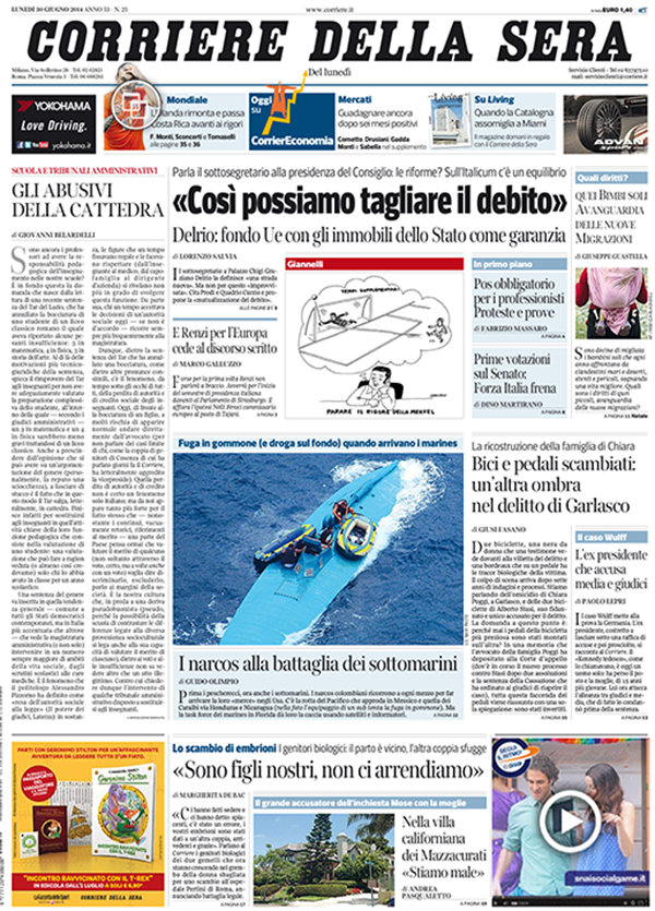 ROMA – Le prime pagine di lunedì 30 giugno si muovono in ordine sparso, scegliendo ognuna le sue priorità e proponendo ai lettori cose diverse, per esempio un’intervista col ministro Poletti su Repubblica e una col ministro Delrio sul Corriere della Sera.