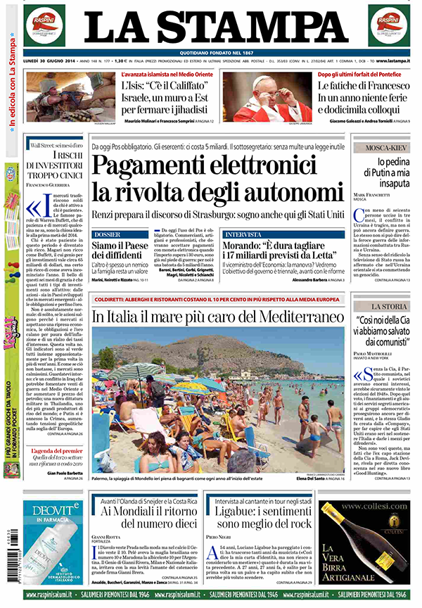 La Stampa invece dà risalto ai pagamenti elettronici obbligatori, da oggi 30 giugno, e le conseguenti polemiche degli autonomi.