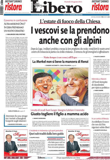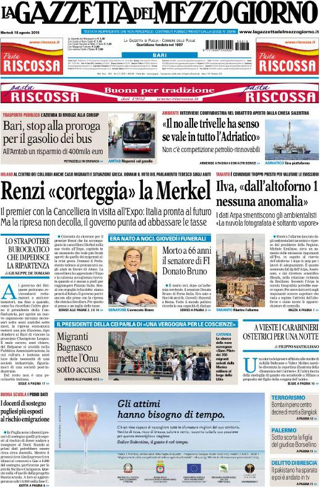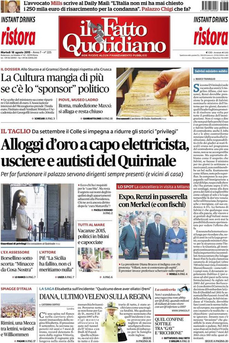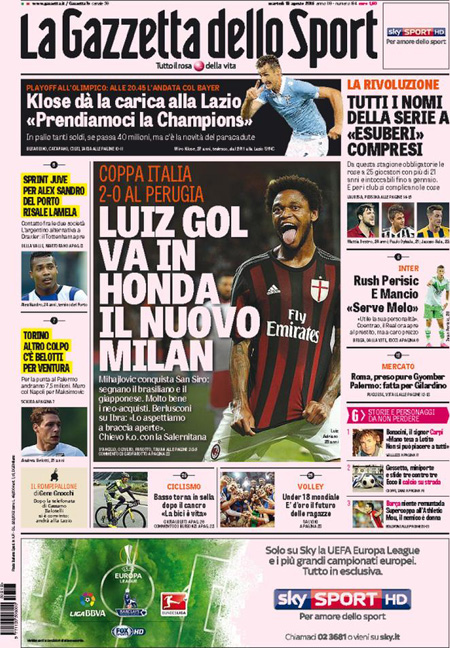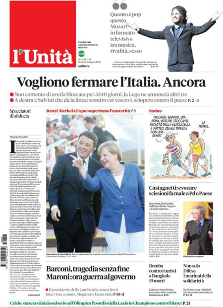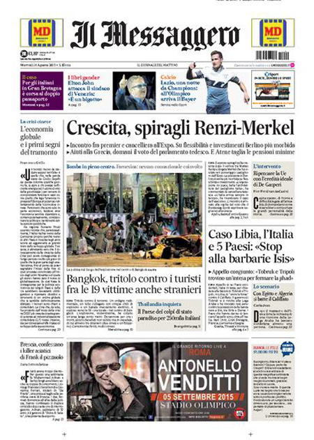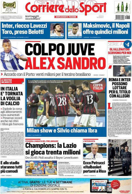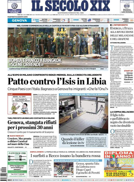 Repubblica invece racconta l’incontro tra Renzi e Merkel avvenuto a Expo, durante il quale si è parlato anche di immigrazione e del ruolo dell’Europa nella gestione della crisi. Sui giornali sportivi spazio alla buona partita del Milan contro il Perugia e il nuovo probabile acquisto della Juventus, Alex Sandro.
